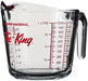 The Fire King Liquid Measuring Cup is available in three convenient sizes: 1 cup (250 ml), 2 cups (500 ml), and 4 cups (1000 ml). Made from clear glass with red measuring lines for easy and accurate reading. This versatile measuring cup is freezer, microwave, and dishwasher safe for added convenience.